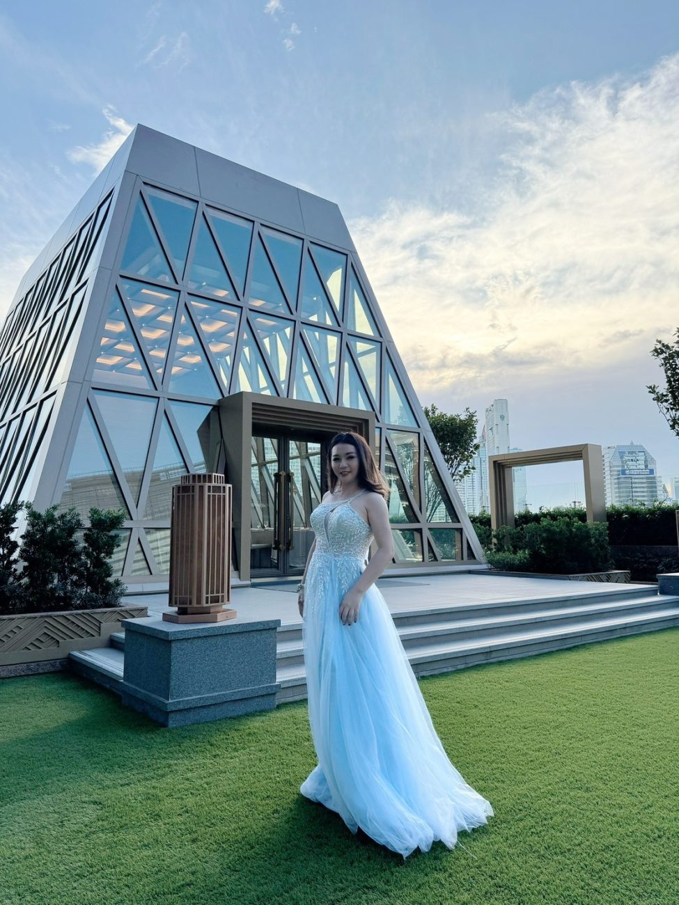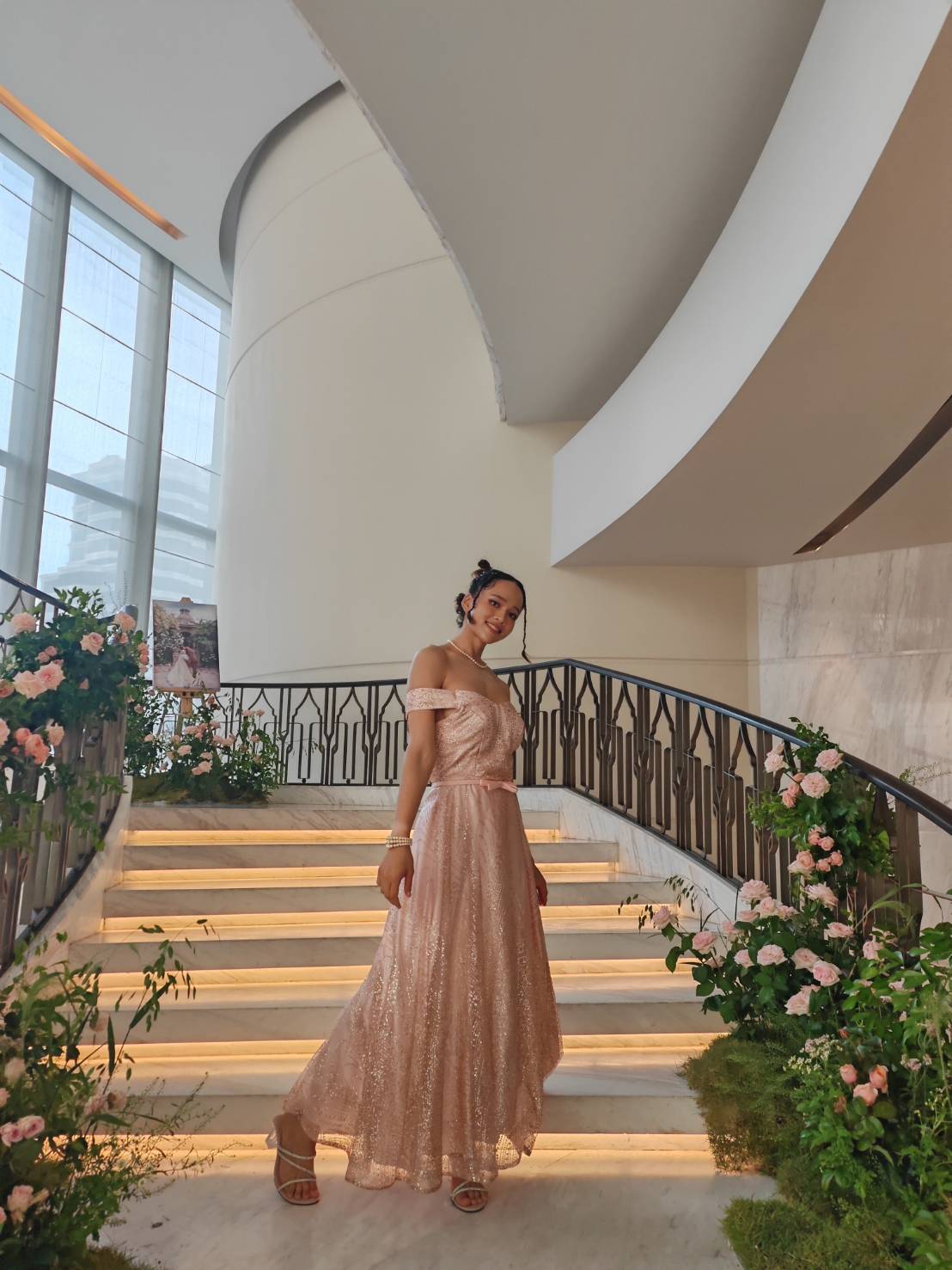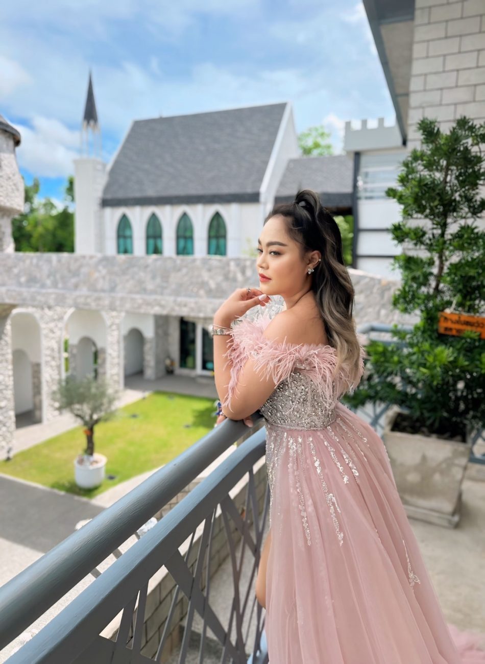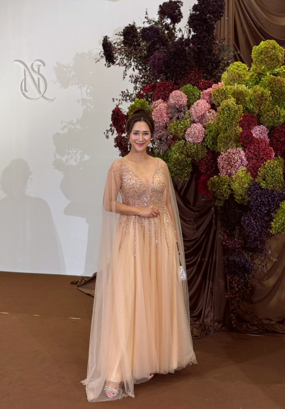 ชุดราตรีผ้ากลิตเตอร์ คือชุดที่ ดึงแสง ดึงกล้อง ดึงสายตา มากที่สุด ไม่ว่าจะถ่ายในห้องจัดเลี้ยง แสงน้อย แสงส้ม หรือแบ็กดรอปดอกไม้ ชุดจะสะท้อนแสงทำให้ตัวคุณโดดเด่นแบบ นางเอกเดินพรมแดง ✨